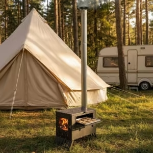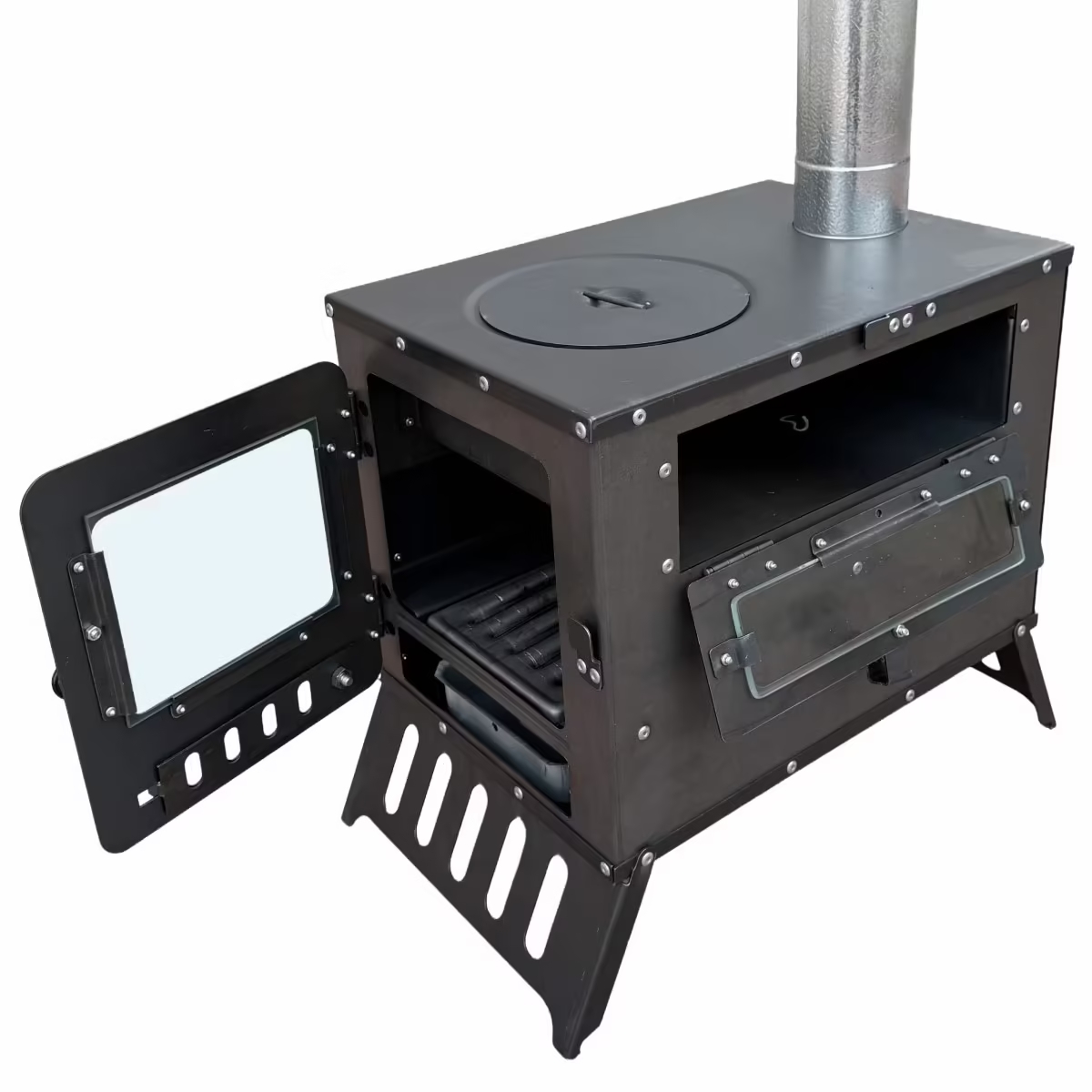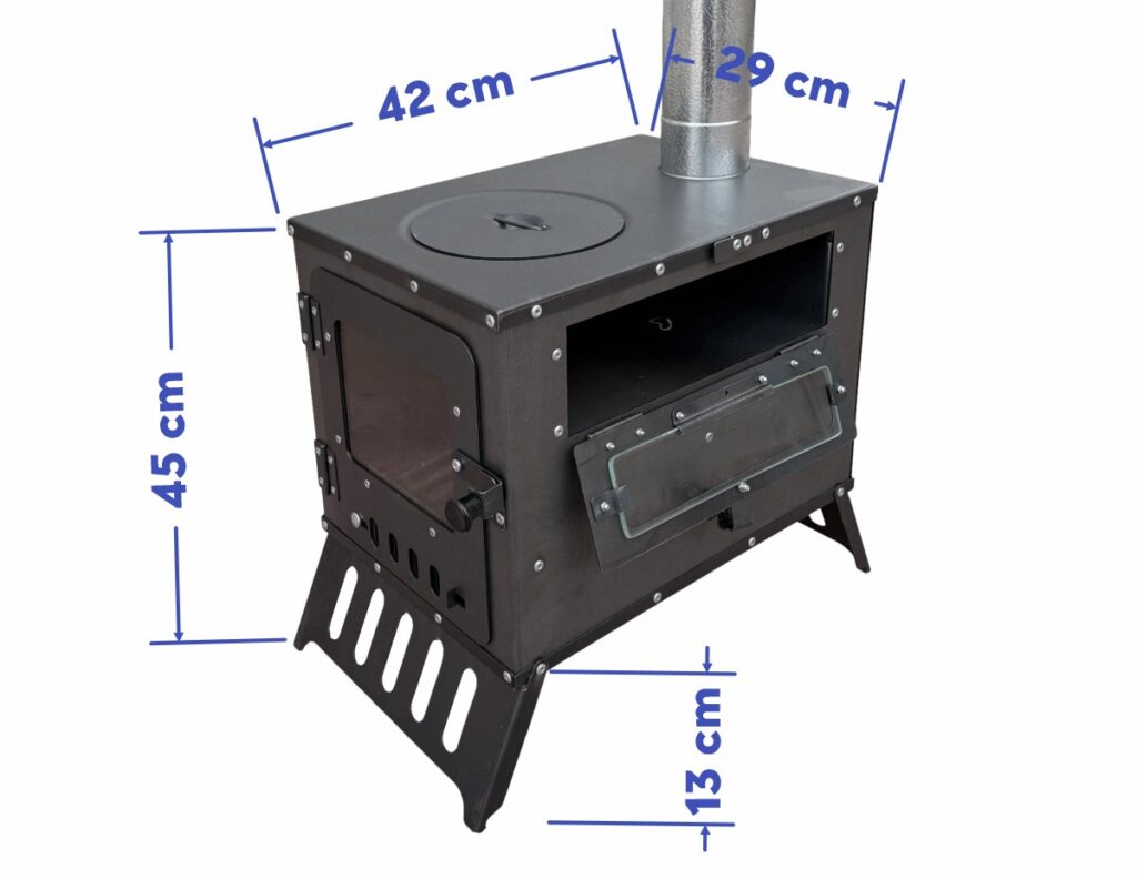 Kadıoğlu KS45F, kamp ve açık alan kullanımları için tasarlanmış fırın ve su ısıtma özelliğine sahip, kompakt ve çok amaçlı bir kamp, çadır sobasıdır.